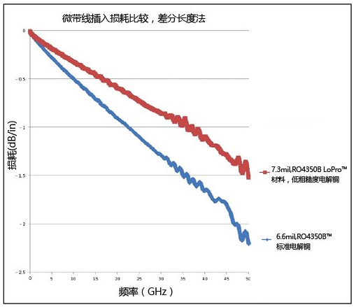 图 3. 在相同材料上使用不同粗糙度铜箔的电路损耗对比为了进一步比较铜箔粗糙度的影响,图 3 显示了在相同的材料上使用不同种类铜箔的电路插入损耗对比。