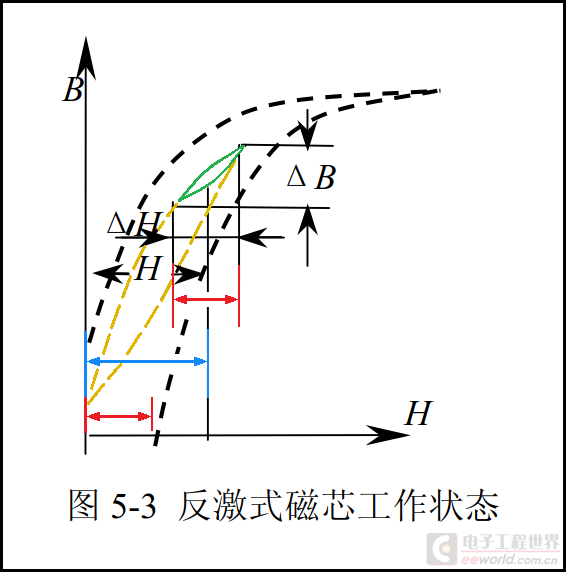 反激开关电源在电流断续工作情况下,铁芯中磁化曲线就是上图中黄色闭合曲线。