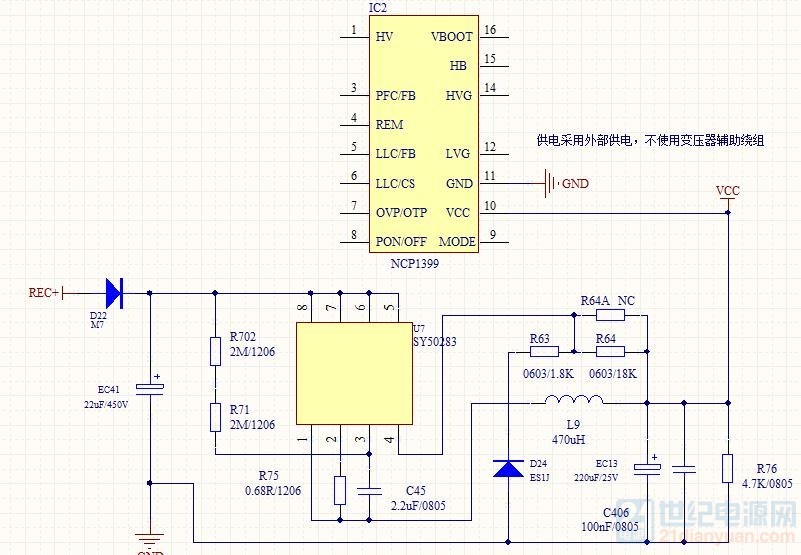 如果我只用一个IC呢,假设是TEA2017,集成了PFC和LLC,一般大一点功率的电源都有继电器,这时我就需要用一个外置的辅助电源了,为了方便,我IC供电也是用外置的辅助电源。