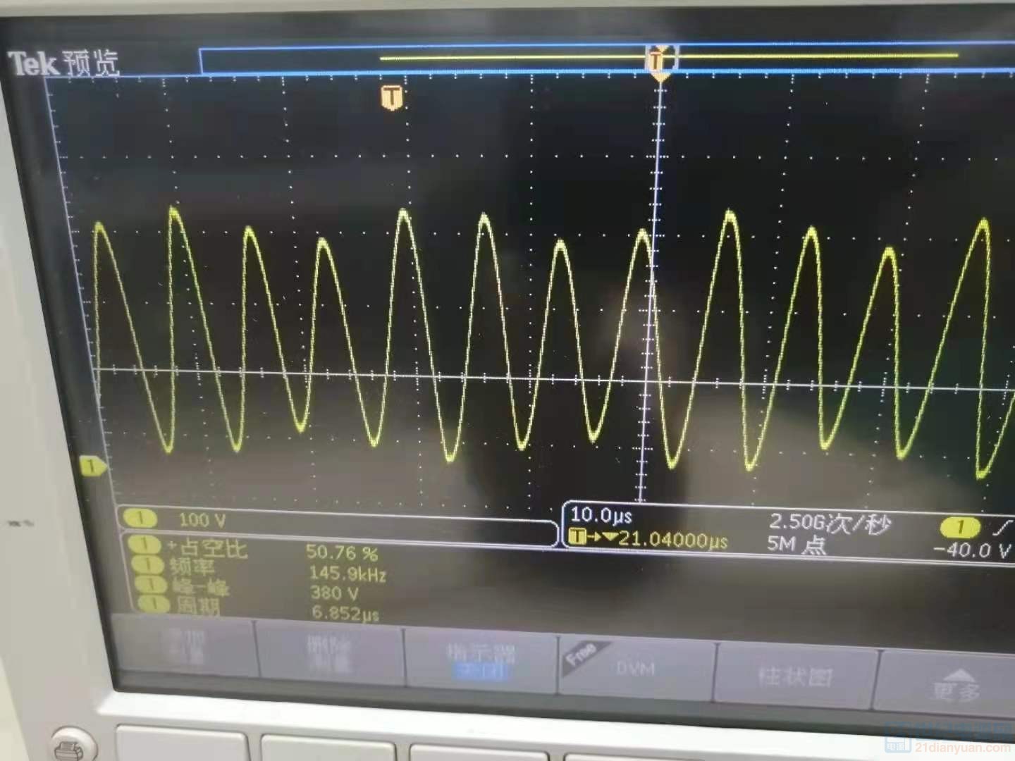 目前测试一个半桥LLC电源,示波器测量谐振电容C1,C2两端波形如图,请问是否正常?